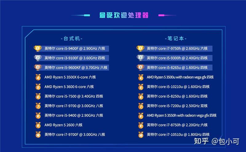 下图是鲁大师2021年最受欢迎处理器top10排行榜,台式机与笔记本的冠军分别为 英特尔 core is-9400f 和英特尔 core i7-9750 看来英特尔还是雄霸天下的。