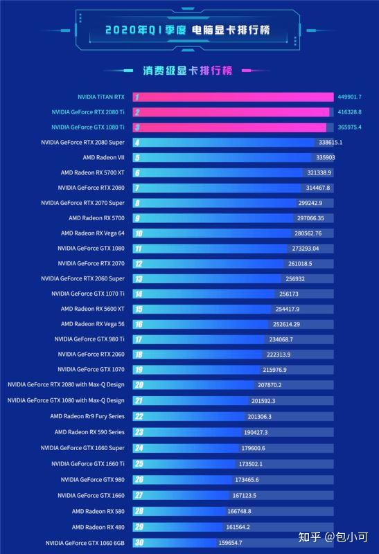 榜单主要针对英伟达和amd公司的显卡做了一个对比,我们可以看到榜单的前4名还是被英伟达公司的显卡牢牢占据。