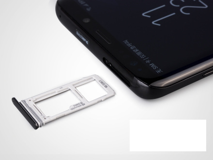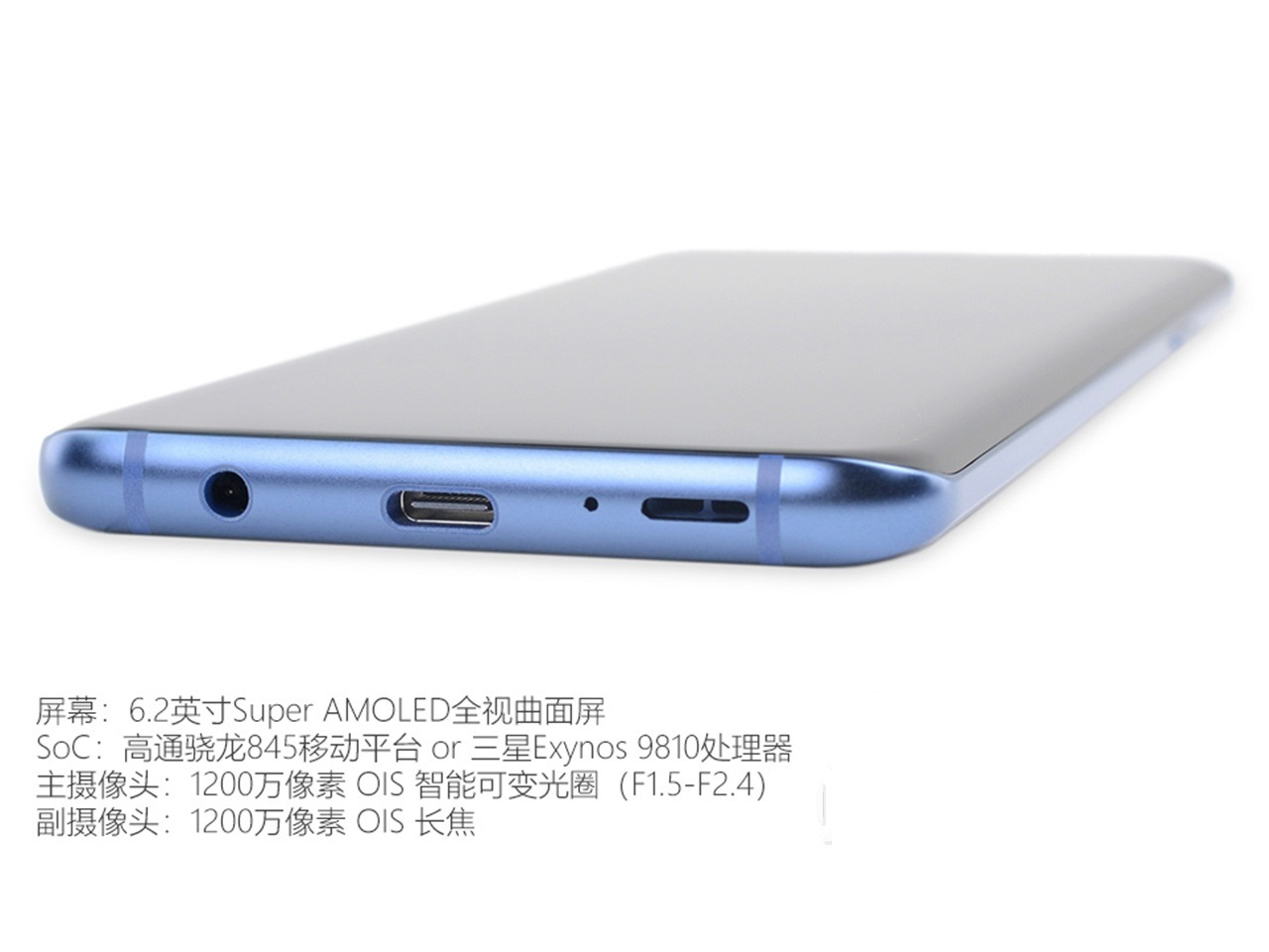 Samsung Galaxy S9+机身顶部设置带有防水胶环的二选一卡托,底部依次为3.5毫米耳机接口、Type-C数据接口、通话麦克、一体式开孔的扬声器