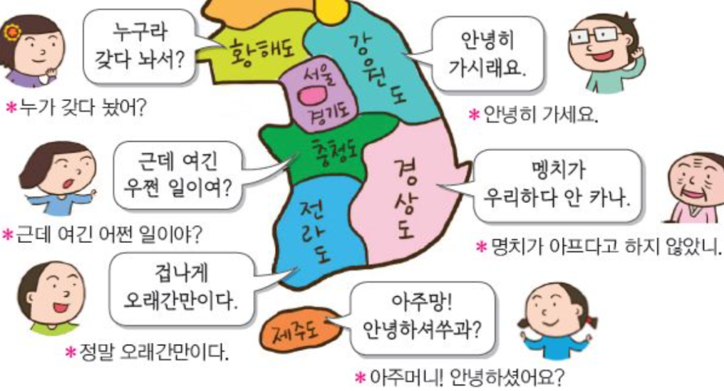 而韩国的方言区主要是后几种,即中部方言、西南方言、东南方言和济州方言。其中,西南方言通常又叫全罗道方言,东南方言通常又叫庆尚道方言。