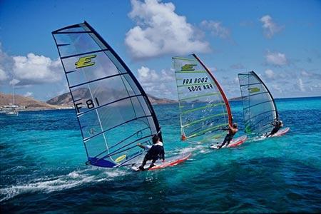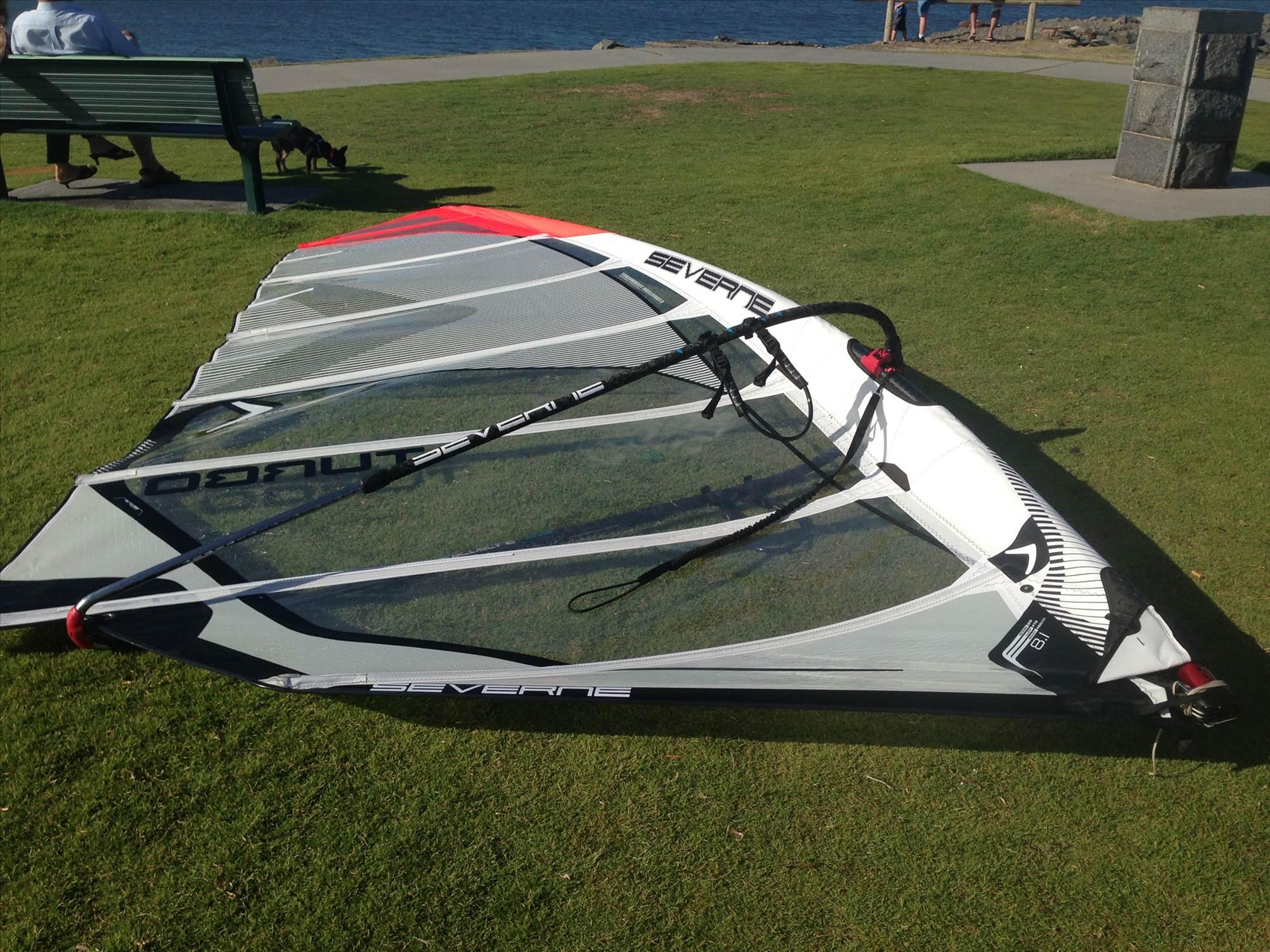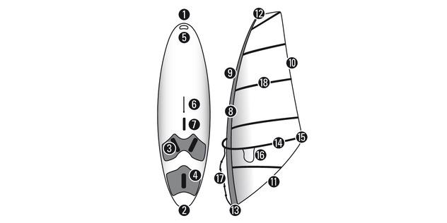 初级使用的帆结构比较简单,面积也比较小通常在3.5-6.5平米,桅杆(mast)基本是直的,帆骨很少或没有,材料以布为主,板的排水量在200L以上,很宽便于平衡,但相当重,一个人搬比较吃力,通常也没有脚带,因为也用不到。