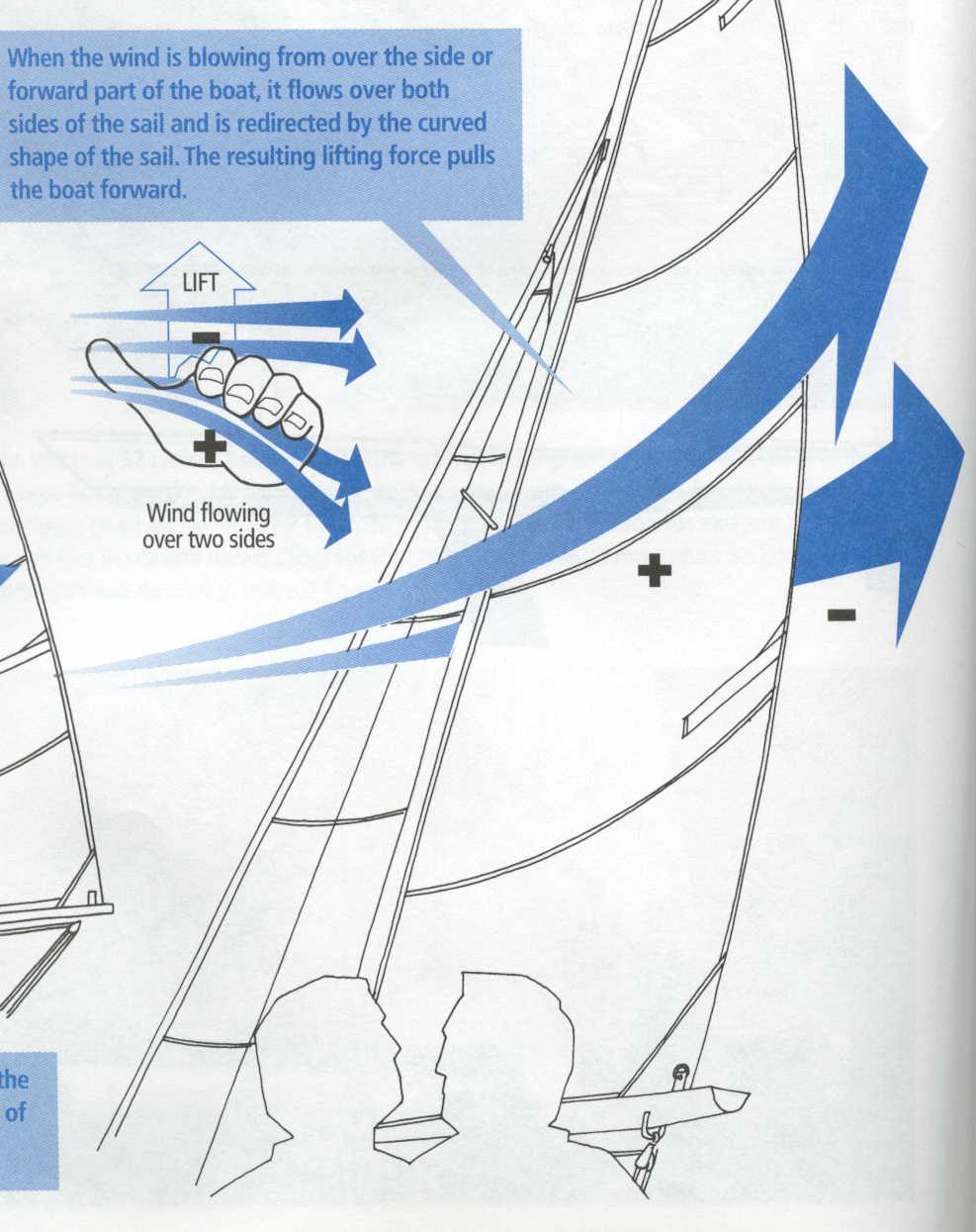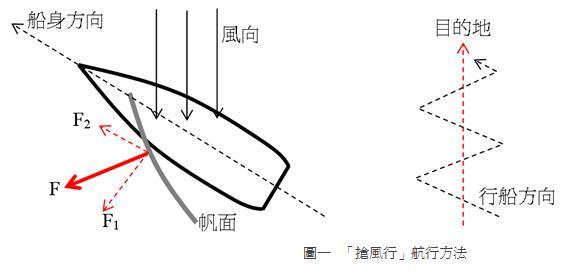风帆能够顺风航行很好理解,但为什么能逆风航行就不好理解了。如同机翼产生升力,风的流速被有效帆弧的形状所改变,根据白努利效应(流速慢的空气压力大于流速慢的空气),内外侧流速不同产生了压力差F,而且方向是垂直于帆弧切线的,这样就改变了原始风力的方向,有了逆风向航行的可能。
