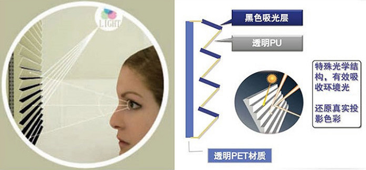 上面这张图展示的比较直观,这种结构的幕布直接将激光电视投射出来的画面,定向平行反射入了观看者的眼睛里,有效的降低了从顶部进入环境光,且可视角度达到了160度。