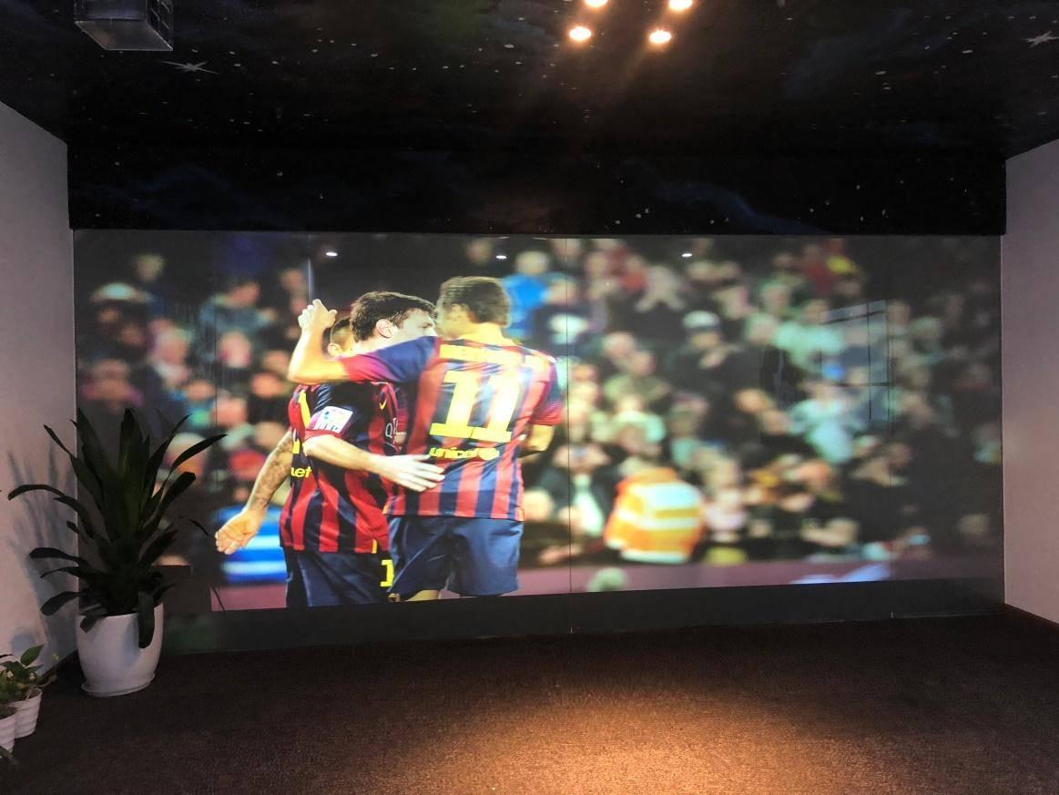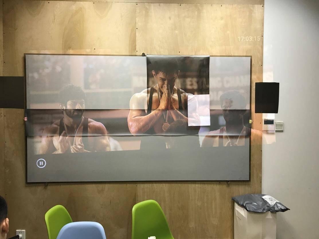 但是为了优化背投质量,在安装使用背投屏幕时,其要求的空间比前投的更大,而且安装投影机的空间要足够暗,使得许多地方都无法使用。目前背投幕主要应用在容纳人数较多的演播厅或者展会的屏幕上。以下就是极米君公司演示厅里面用极米投影以及背投幕投射的画面。