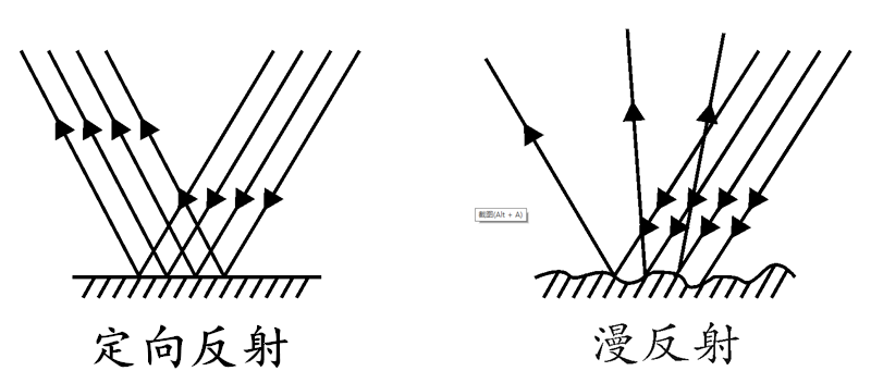 这个反射过程可以被分为漫反射和定向反射两种。漫反射是由于反射面凹凸不平,反射的光线是杂乱无章的,向各个方向的都有,光线不集中,亮度通常较低,但是照射的范围较广,比如纸张、墙壁等;定向反射就容易理解了,光线被反射到同一个方向,光线集中,所以亮度通常较高,但是照射的范围就要窄一些,比如镜面。