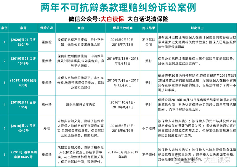 我整理了一些两年不可抗辩理赔纠纷诉讼案例: