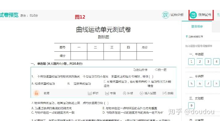 3)试卷的修改和保存。点击”试题预览”进入试题预览界面,可以看到选好的所有试题,这里可以进行修改,包括标题,也可以删除、更改试题。修改好没问题后就可以点击右边上端的“保存试卷”如图12