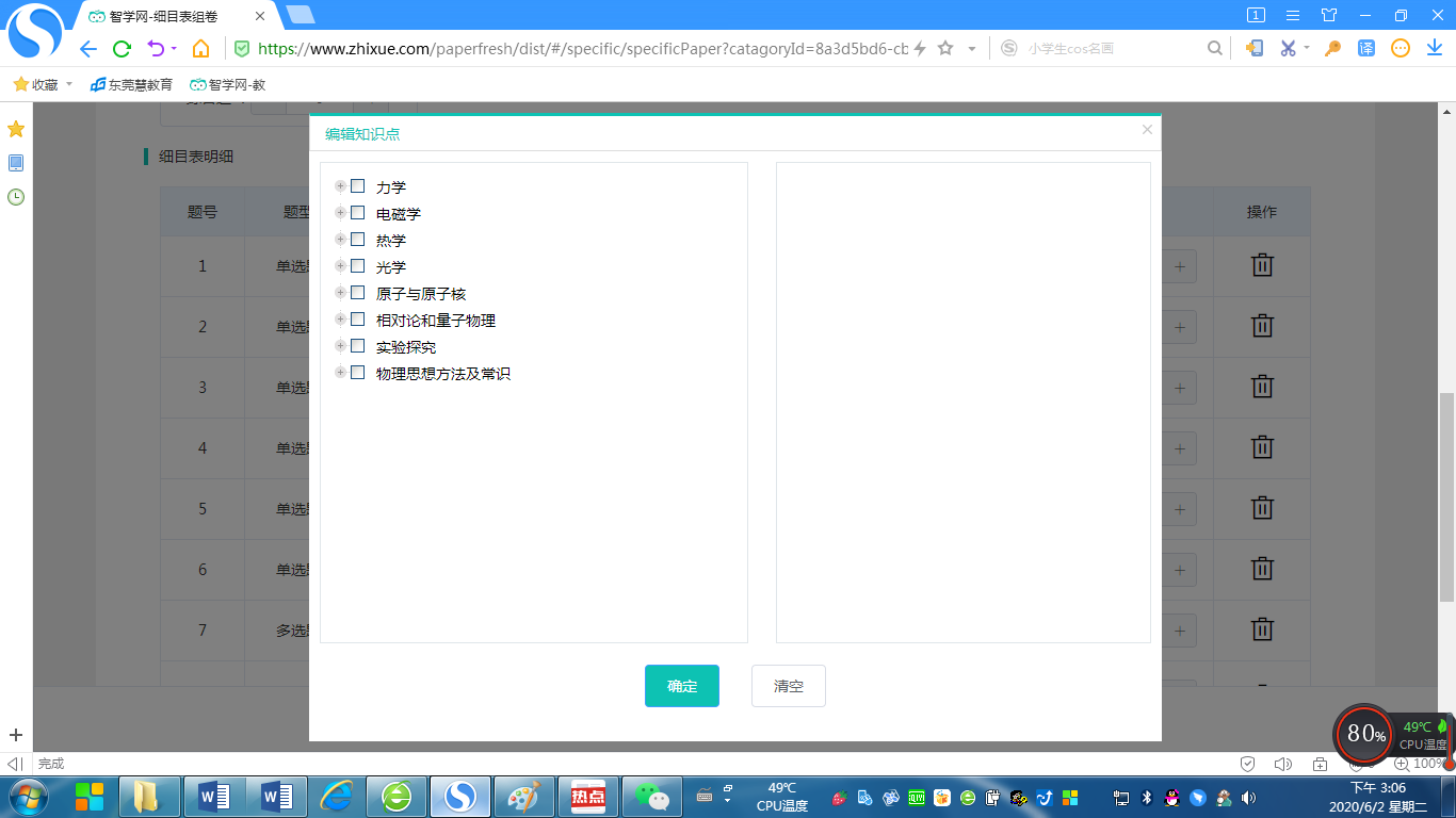 点击知识点下方蓝色的“添加知识点”进入编辑知识点页面,这里可以选择要考察的知识点,如图,对应的是每个章节的每个知识点