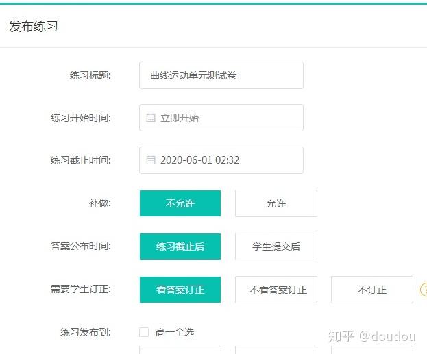 1.考试的设置与发布。点击发布练习就进入考试的设置界面如图20, 这里可以设置考试的名称,具体开始和结束时间,是否可以补考,答案公布时间,考试对象的选择,任课老师只能给自己班学生布置,备课组长可以给整个年级布置。