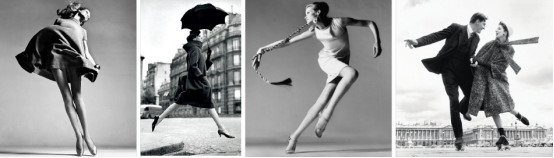 与前面两位摄影大师不同 ,Avedon的特点在于画面的张力,他激发模特的“活力”以及情绪,表现模特极致的状态。 在Avedon之前的时尚摄影,表情总是端庄、静止、严肃的,虽然画面唯美,但永远的是Deadpan扑克脸难免会视觉疲劳。Avedon突破了这一点, 他通过谈话、聊天,挖掘模特内心深处的情绪,总能调动出模特活力四射的一面,一览无遗地反映到时尚作品中。 从Avedon开始,时尚摄影不再是死气沉沉、呆板的皮囊,而是充满活力的乐观展现。Avedon被誉为时尚摄影的变革者, 他的作品中,模特不仅有丰富的面部表情,还有夸张的肢体语言,画面动态十足、充满活力、激情,颇具戏剧张力。