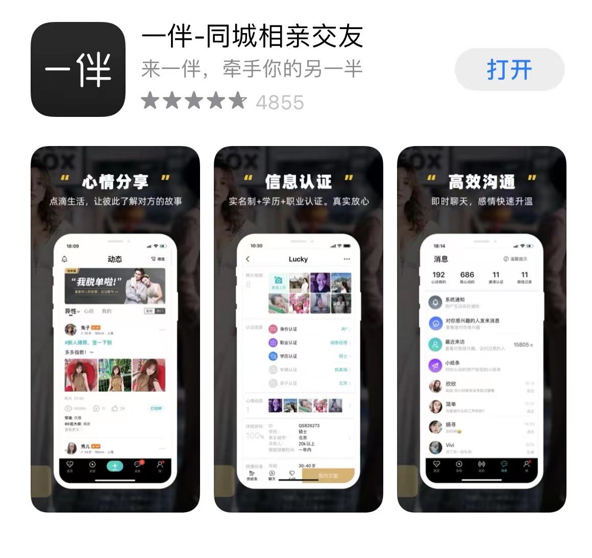 一伴是一款牵手成功率很高的相亲软件。它跟一般社交软件不同,每个人只能拥有一个账号,并且未成年人和已婚人士不能使用,杜绝了浑水摸鱼的人进入。