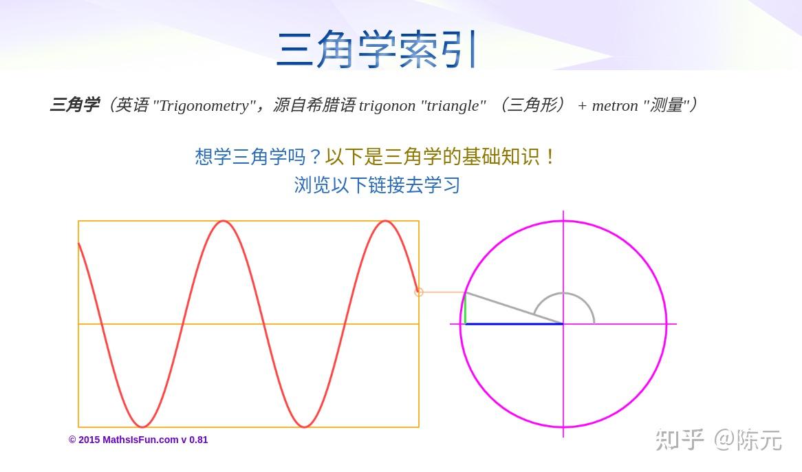 它对于每个知识点,都不厌其烦的用图解来讲述,非常容易理解,而且一些图示是可交互的,非常的有意思,例如这个介绍三角函数的例子: