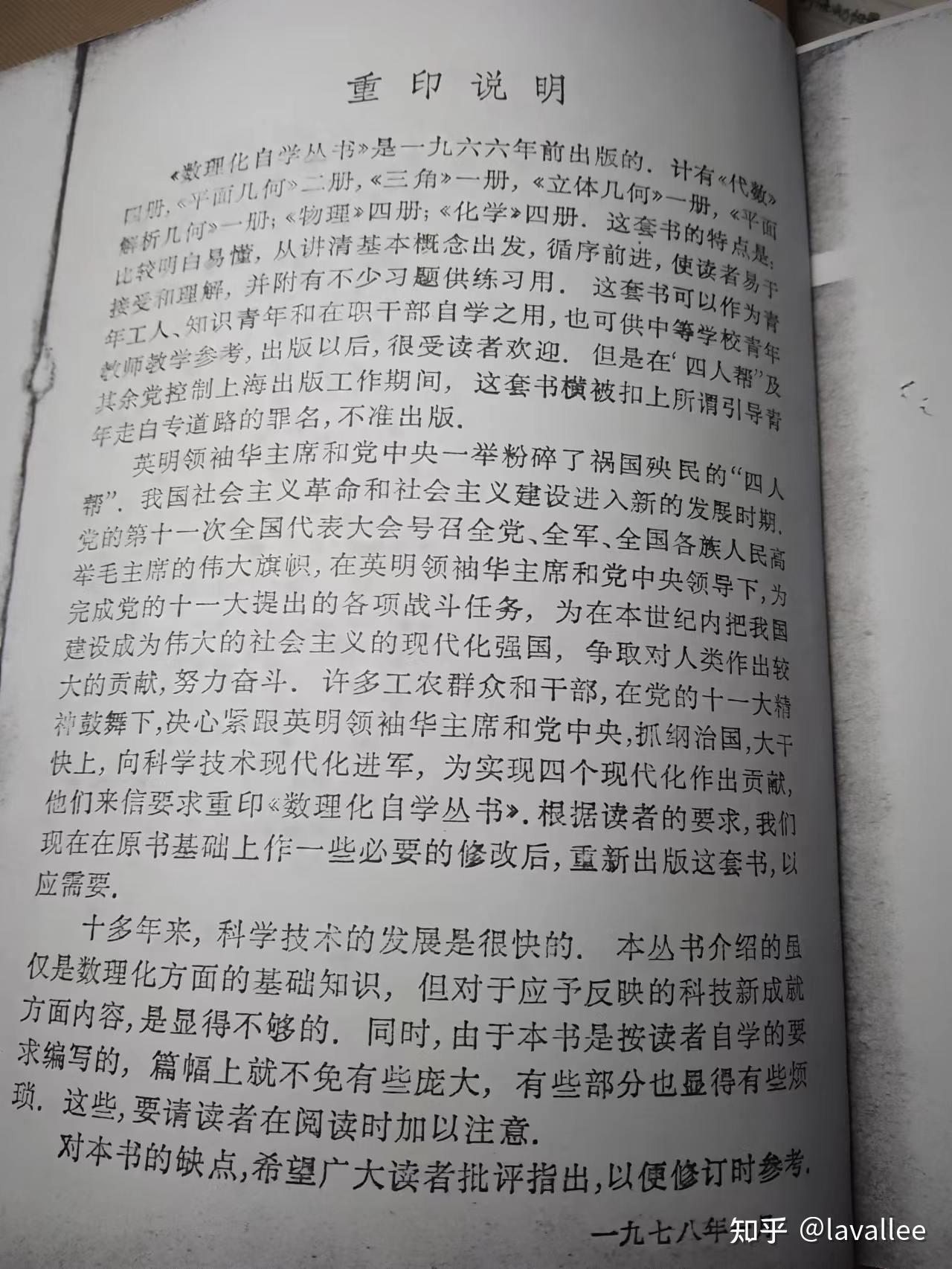上海科学技术出版社曾在1966年之前出版了一套《数理化自学丛书》,然后在1978年一月又重印出版。计有《代数》4册,《平面几何》2册,《三角》1册,《立体几何》1册,《平面解析几何》1册;《物理》4册;《化学》4册。其特点就是比较明白易懂,从讲清基本概念出发,循序前进,使读者易于接受和理解,并附有不少习题供练习用。可供自学,也可供中等学校青年教师教学参考。出版之后,很受读者欢迎。