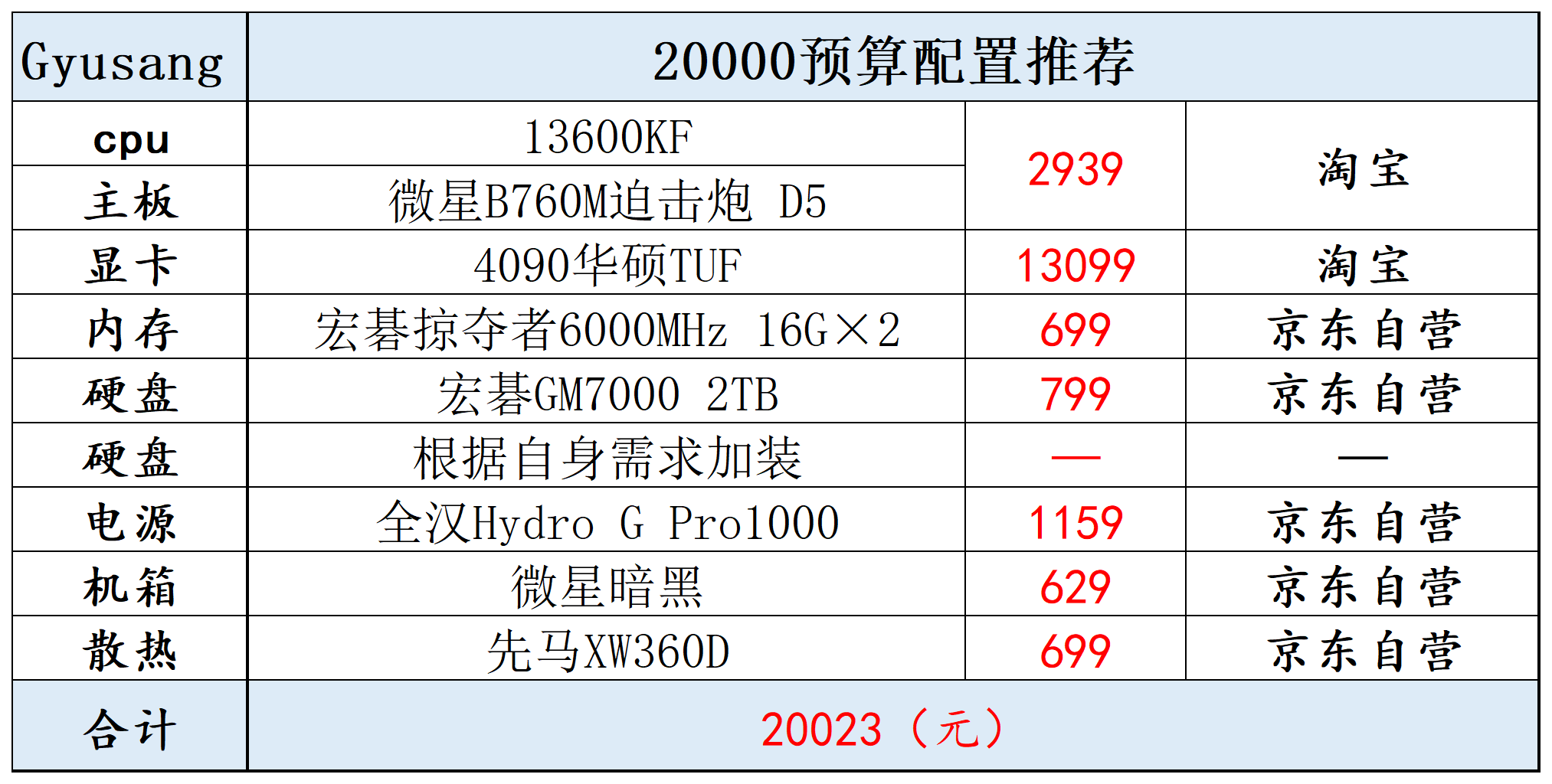 20000预算可以13600K+4090,这么配是性价比最高的游戏主机配法,属于是花最少的钱,配最强的游戏主机,显卡无脑拉4090,4090现在价格普降,华硕TUF也降到了首发价左右,性价比更高的还有七彩虹ADOC,火水神非OC版本价格现在也不高,加几百就可以入手。