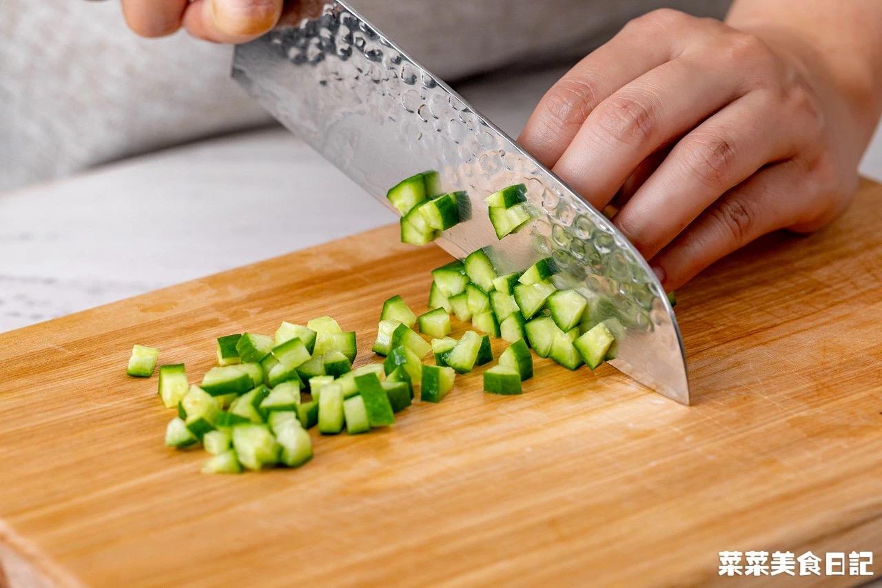 1、将叉烧、胡萝卜、青瓜分别切成个头均匀的小丁