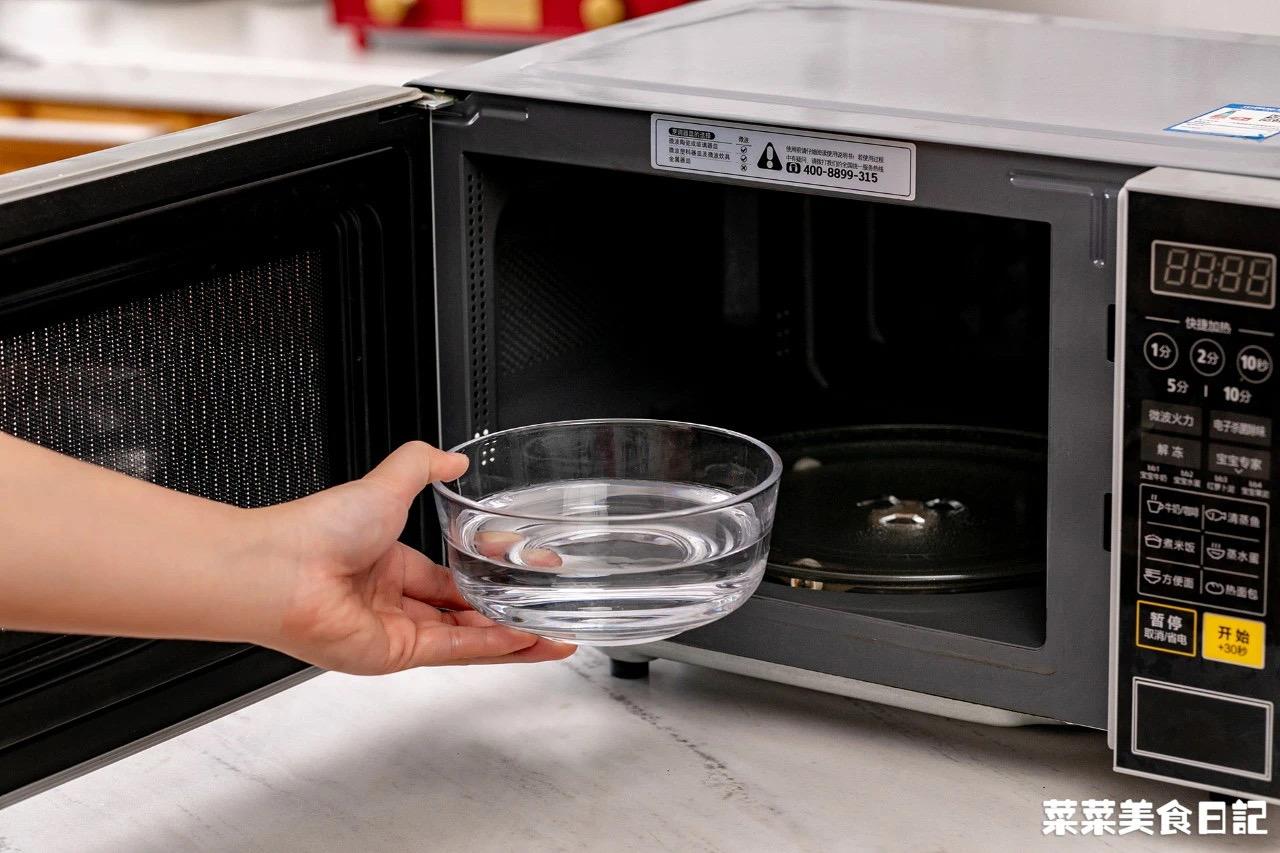 1、碗里加入1/2的水,微波炉高火加热1分30秒(水不能倒满,避免沸腾时溢出)