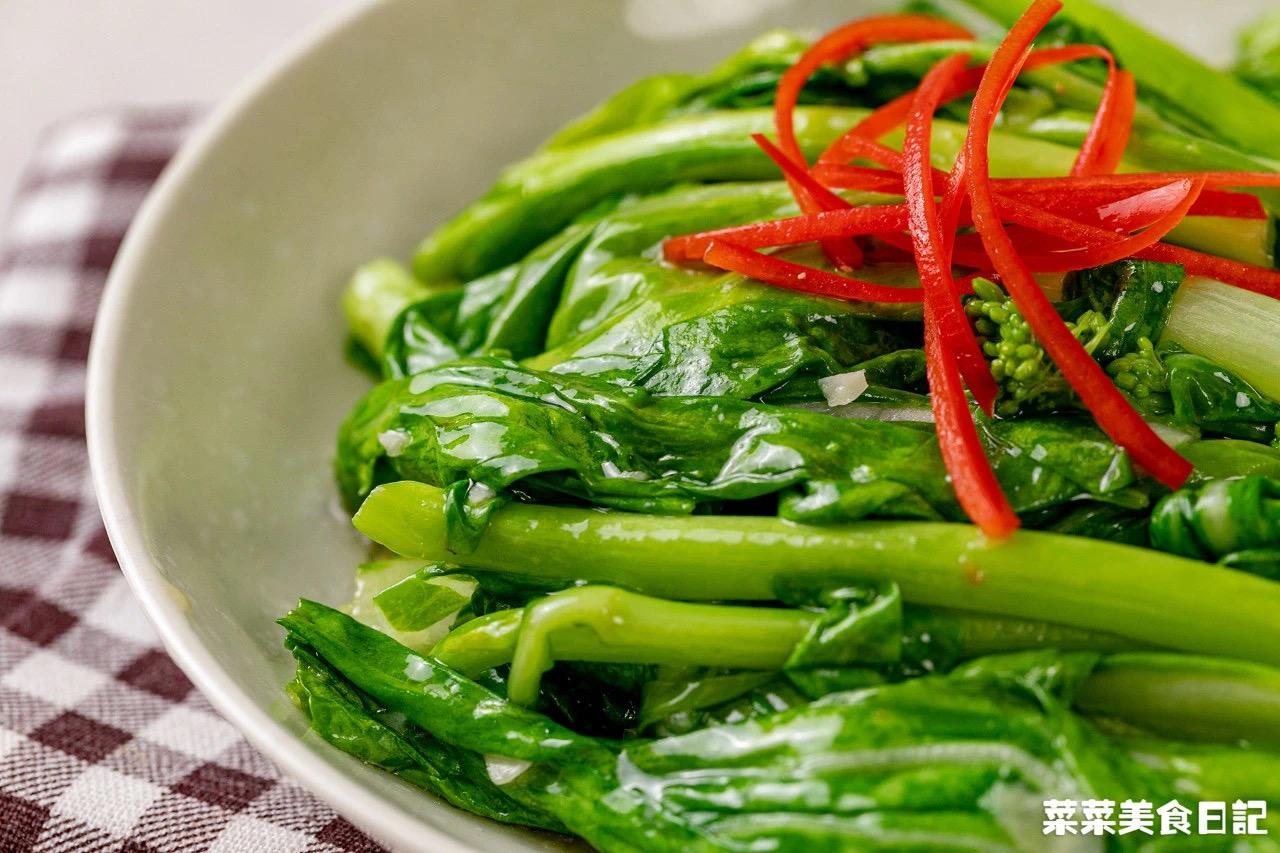 食材: 白菜苔/绿叶菜200g,蒜末1大勺,食用油2大勺,蚝油2小勺,盐适量