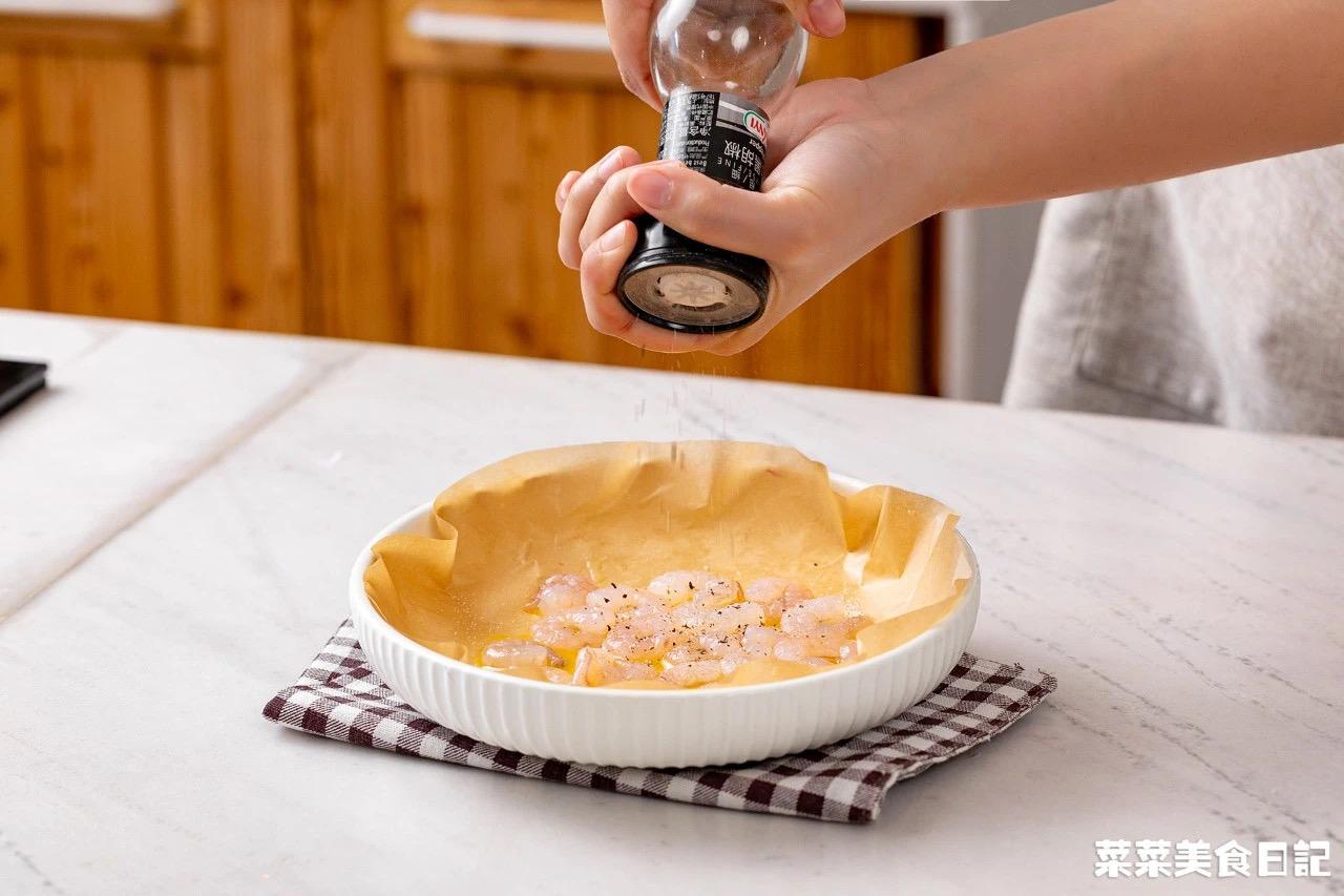 2、再加入虾仁、少许盐和黑胡椒,拌匀后再入微波炉高火加热1分30秒