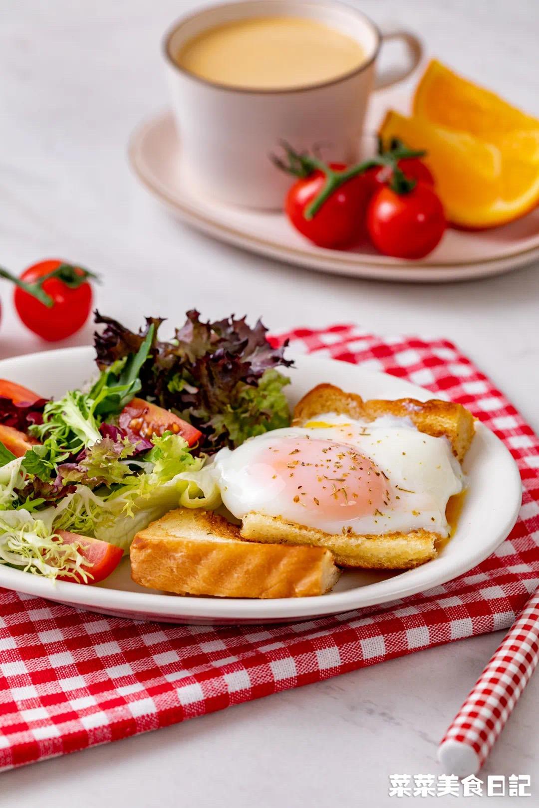 蔬菜沙拉伴碟,底下再垫两片吐司,再配上一杯拿铁,不知道的,还以为你享用的是星级酒店早餐。