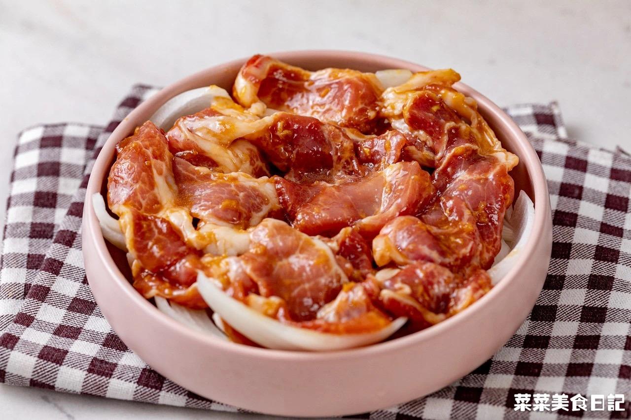 食材: 梅花肉300g,白洋葱半个,生姜泥15g,蒸鱼豉油2大勺,味淋1大勺,细砂糖1小勺,淀粉2小勺,食用油1大勺