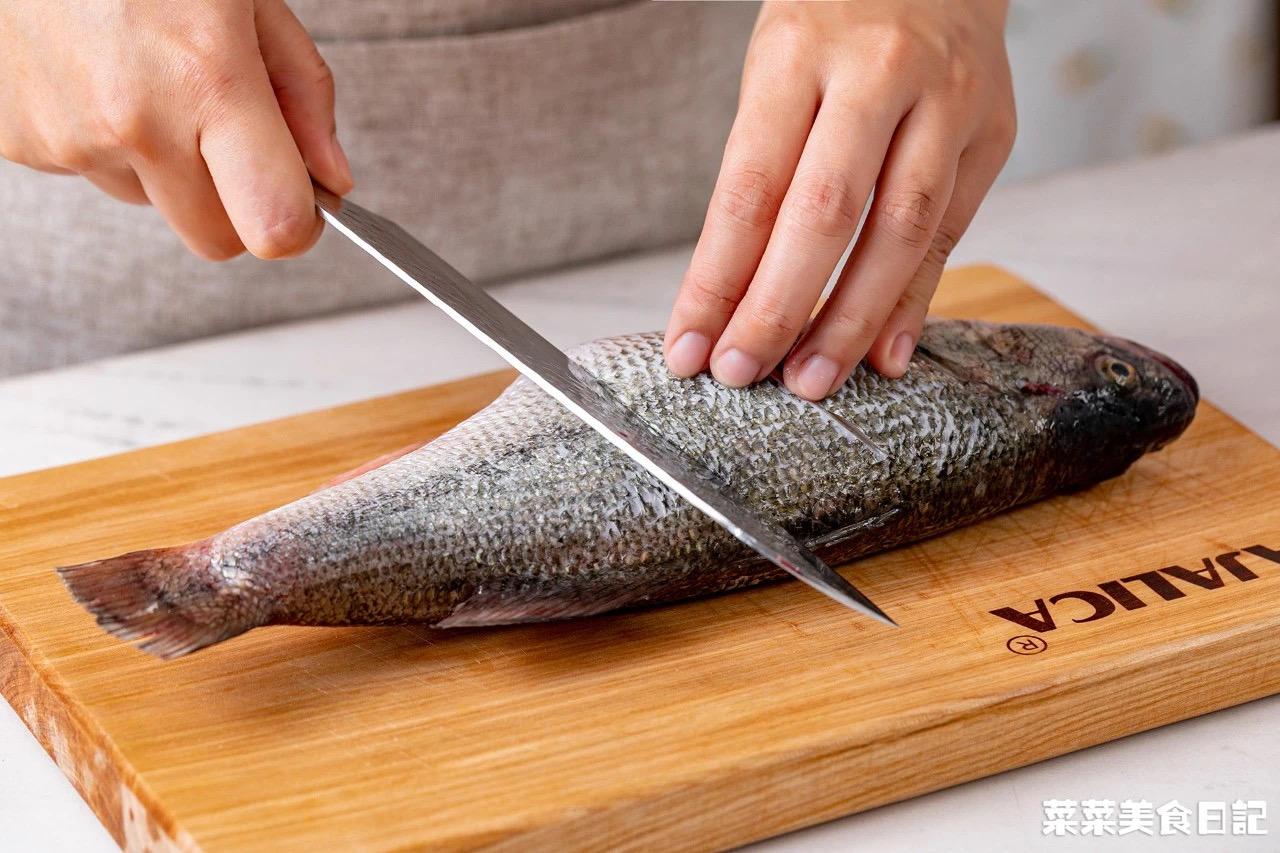 1、鱼身正反面各用刀划开两刀,再把鱼眼睛戳破,避免加热时...BOOM~