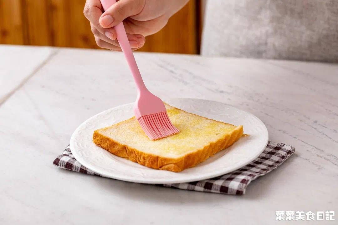 5、吐司表面刷上一层黄油,微波炉高火加热50秒至表面变脆