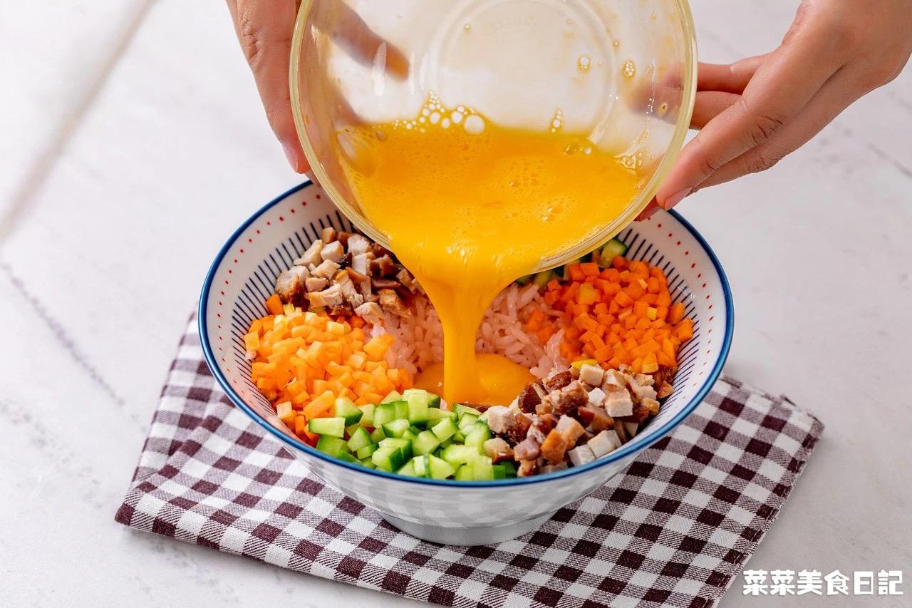 3、将米饭中间挖空,周边铺上切好的叉烧丁、胡萝卜丁、青瓜丁