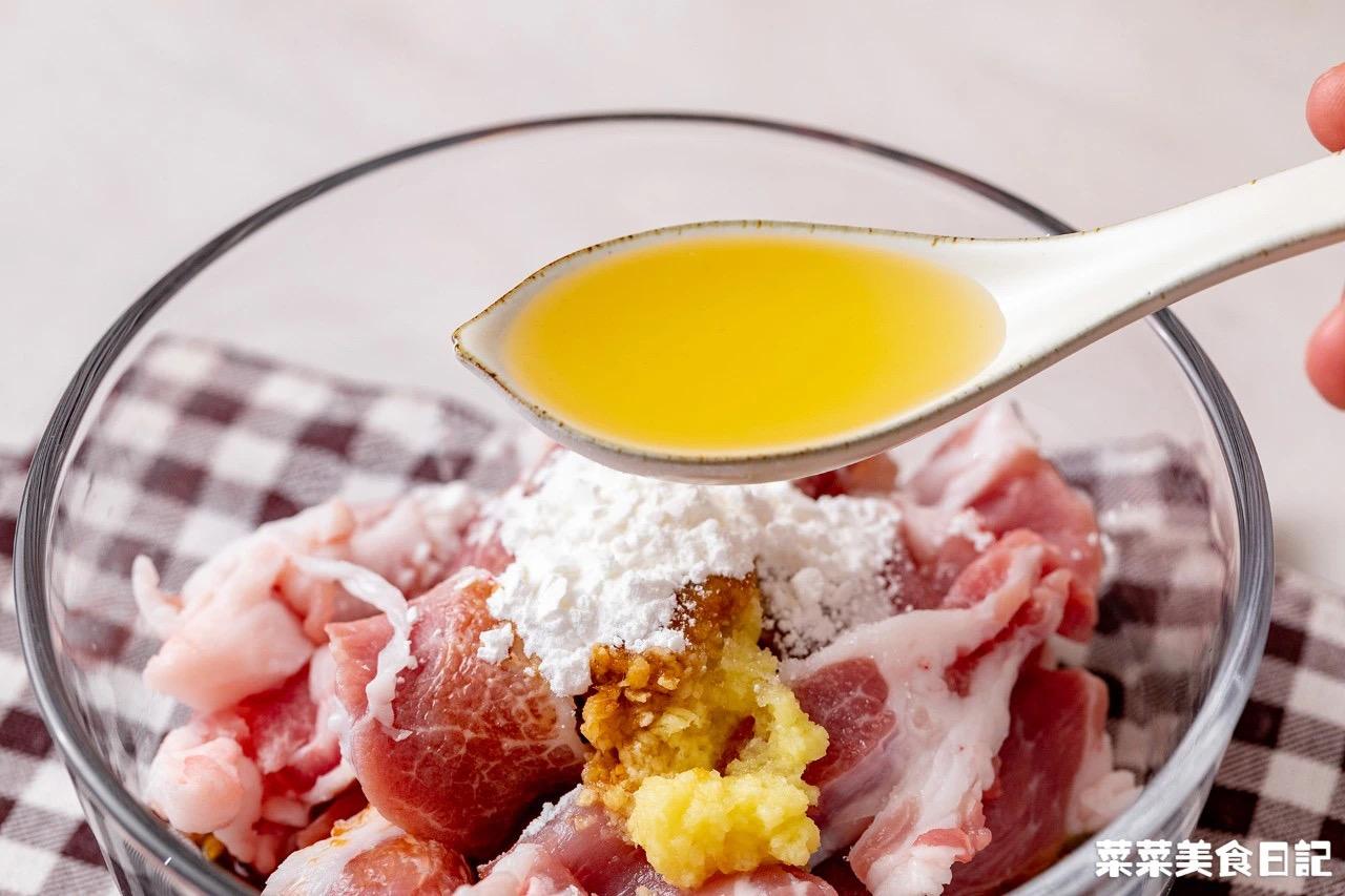 1、梅花肉切片,加入15g生姜泥、2大勺蒸鱼豉油,1大勺味淋,1小勺细砂糖,2小勺淀粉,1大勺食用油,搅拌均匀后腌制15分钟以上