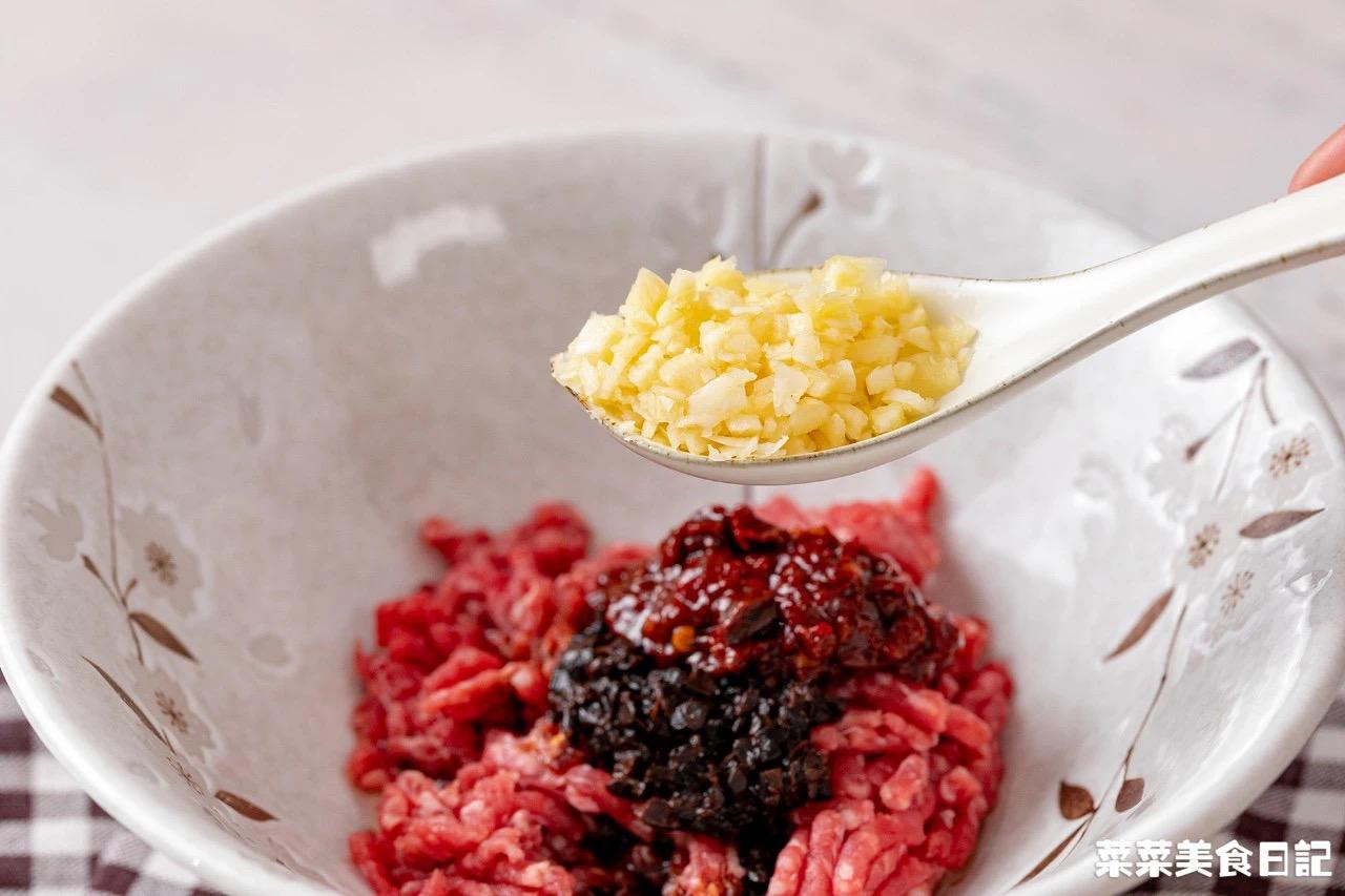 1、牛肉末、食用油、酱油、豆豉、蒜末、郫县豆瓣酱、淀粉水放入碗中拌匀