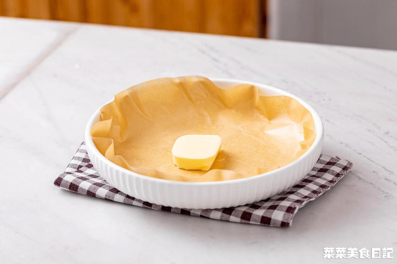 1、盘子里垫上油纸防粘,加入一小块黄油,微波炉中火加热20s至黄油融化