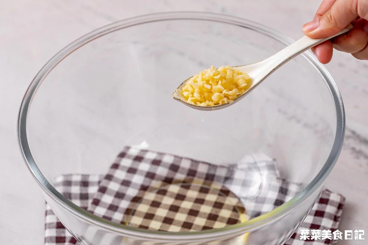 1、大玻璃碗里加入2大勺食用油,再加入1大勺蒜末,微波炉中高火加热30秒