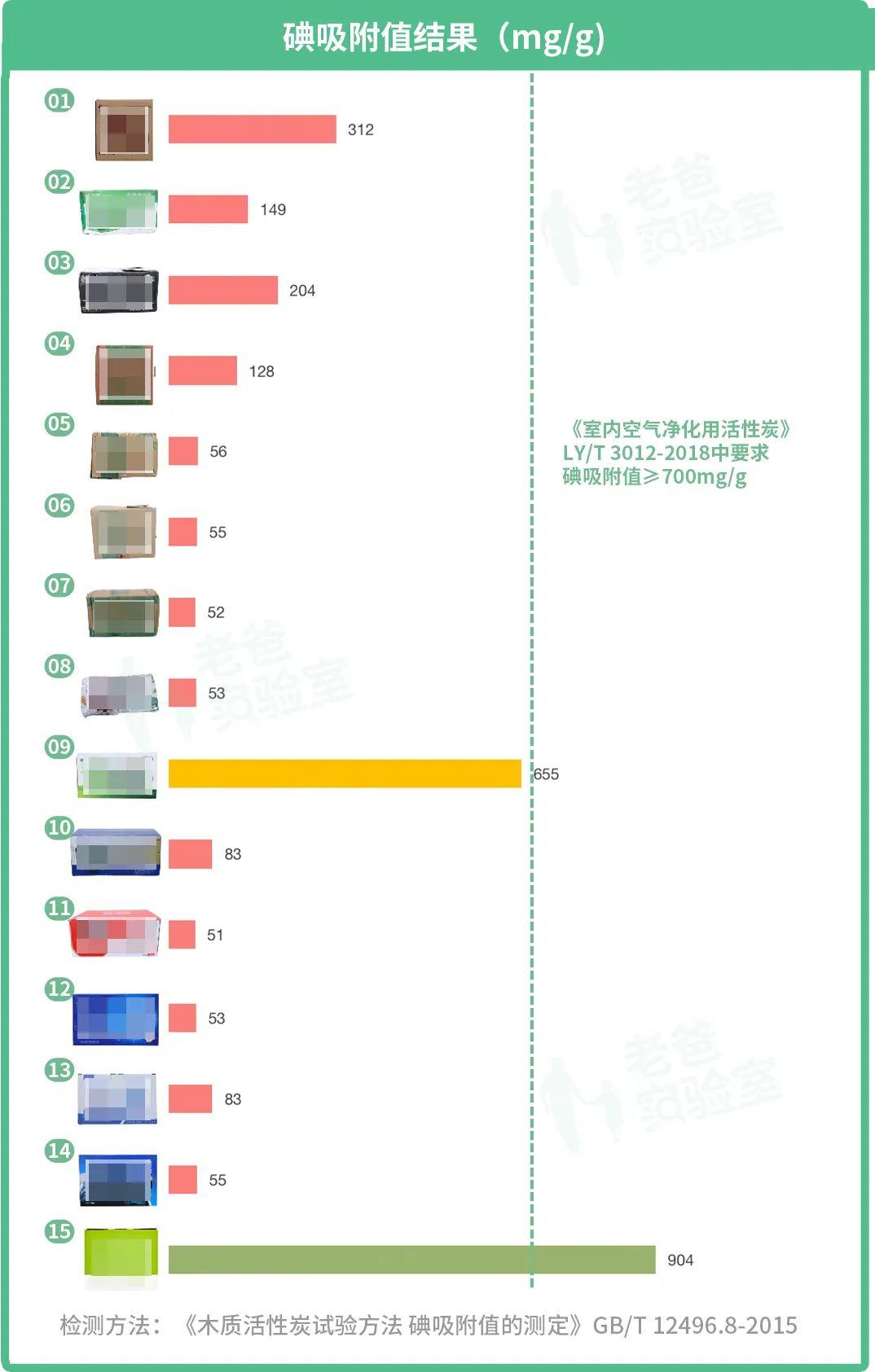 我们之前测了 15 款活性炭,结果 大多数都没有达到《室内空气净化用活性炭》LY/T 3012-2018 中碘吸附值 ≥700mg/g 的要求。
