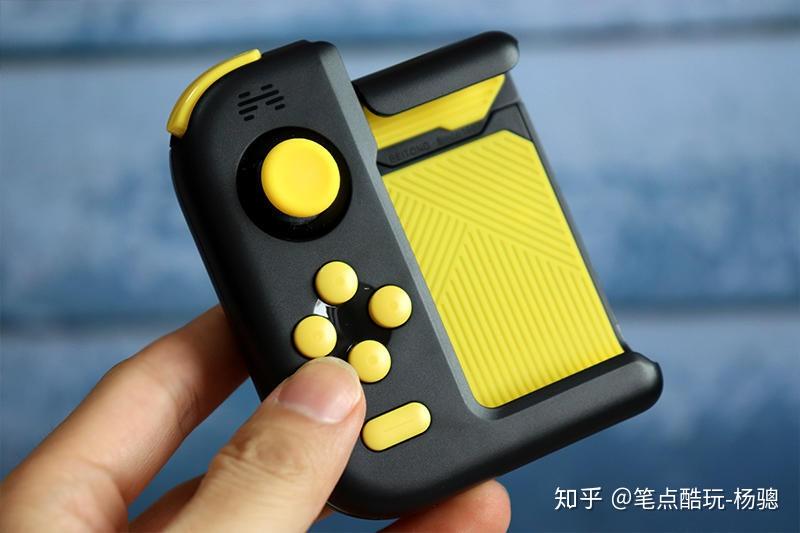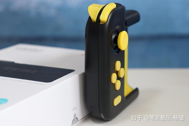 先给手柄来一张。黑黄配色,与G1的黑红配色有别。摇杆下方的方向键也成了独立的4个圆键,底部额外多了一个长圆形“配对键”。
