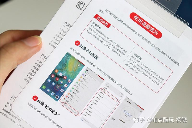 翻到包装背面发现额外贴了一张“使用温馨提示”,主要对系统底层智能适配的荣耀、华为机型提供彩页图文指导,跟我目前使用机器的关系不大。不过上面提及苹果(iOS端特有灵通模式,APP Store官方游戏直接就能玩)和其他安卓机型也有激活办法,比如除了刚才的实体激活器外,也有PC软件激活,电脑数据线连手机,按步骤即可实现。