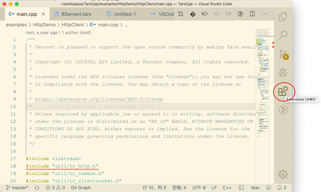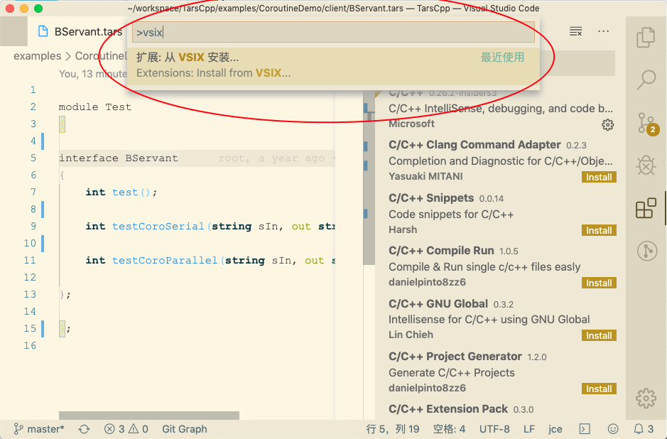 主要功能:C++语法识别、智能补全、代码跳转、调用依赖识别等,注意,下文中描述如果没有指明是需要单独手动下载的话,一般来说都是指通过 VSCode 侧边栏上的扩展按钮来安装插件。