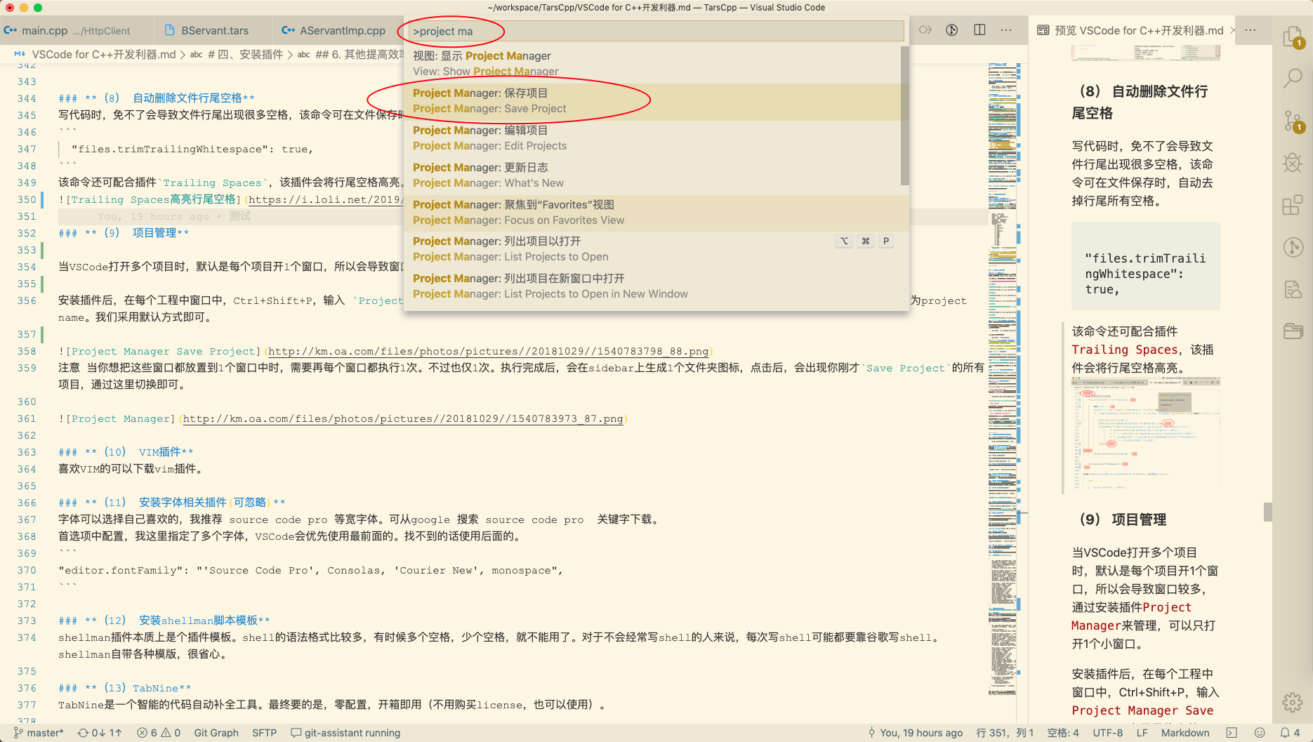 写代码时,免不了会导致文件行尾出现很多空格,该命令可在文件保存时,自动去掉行尾所有空格。