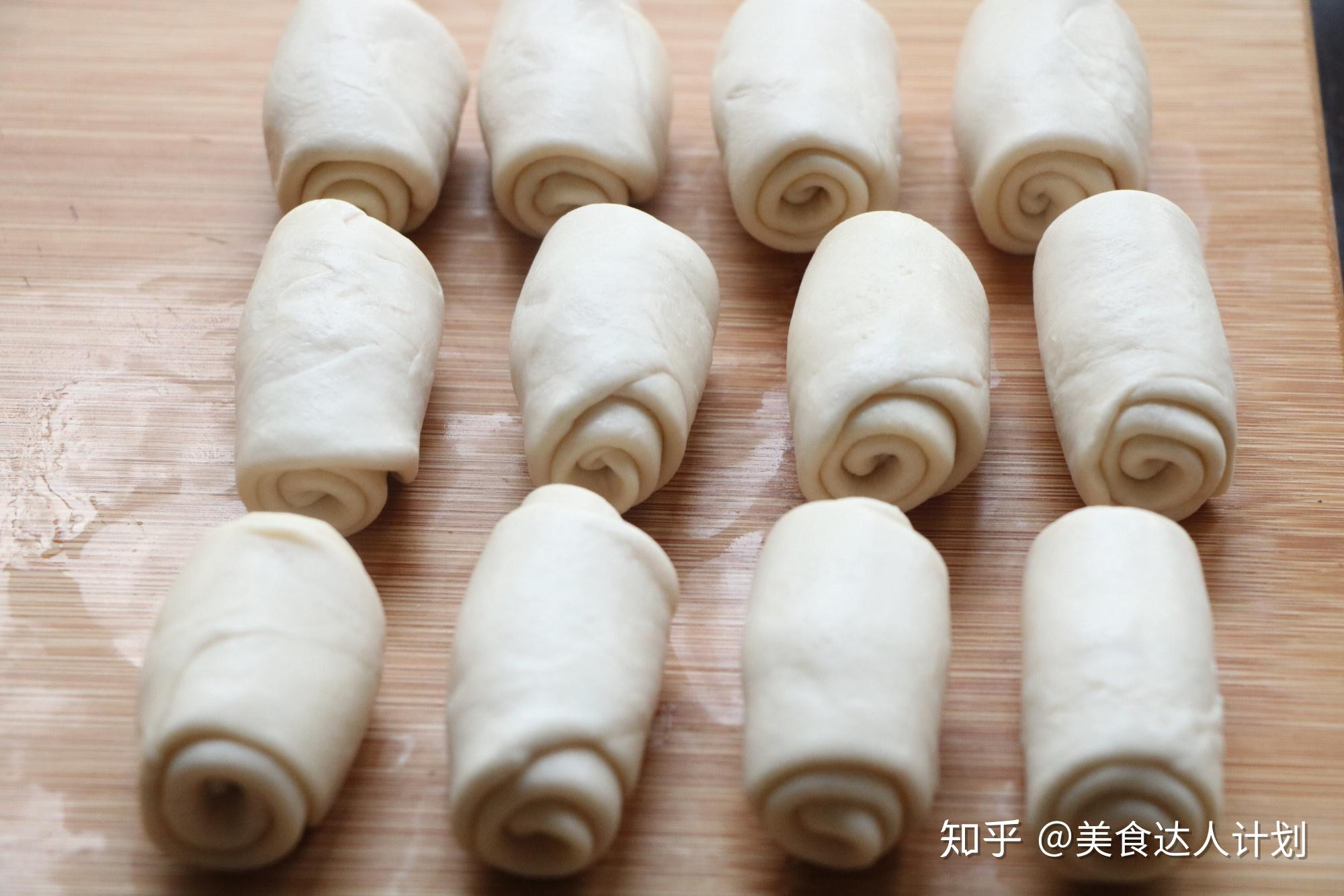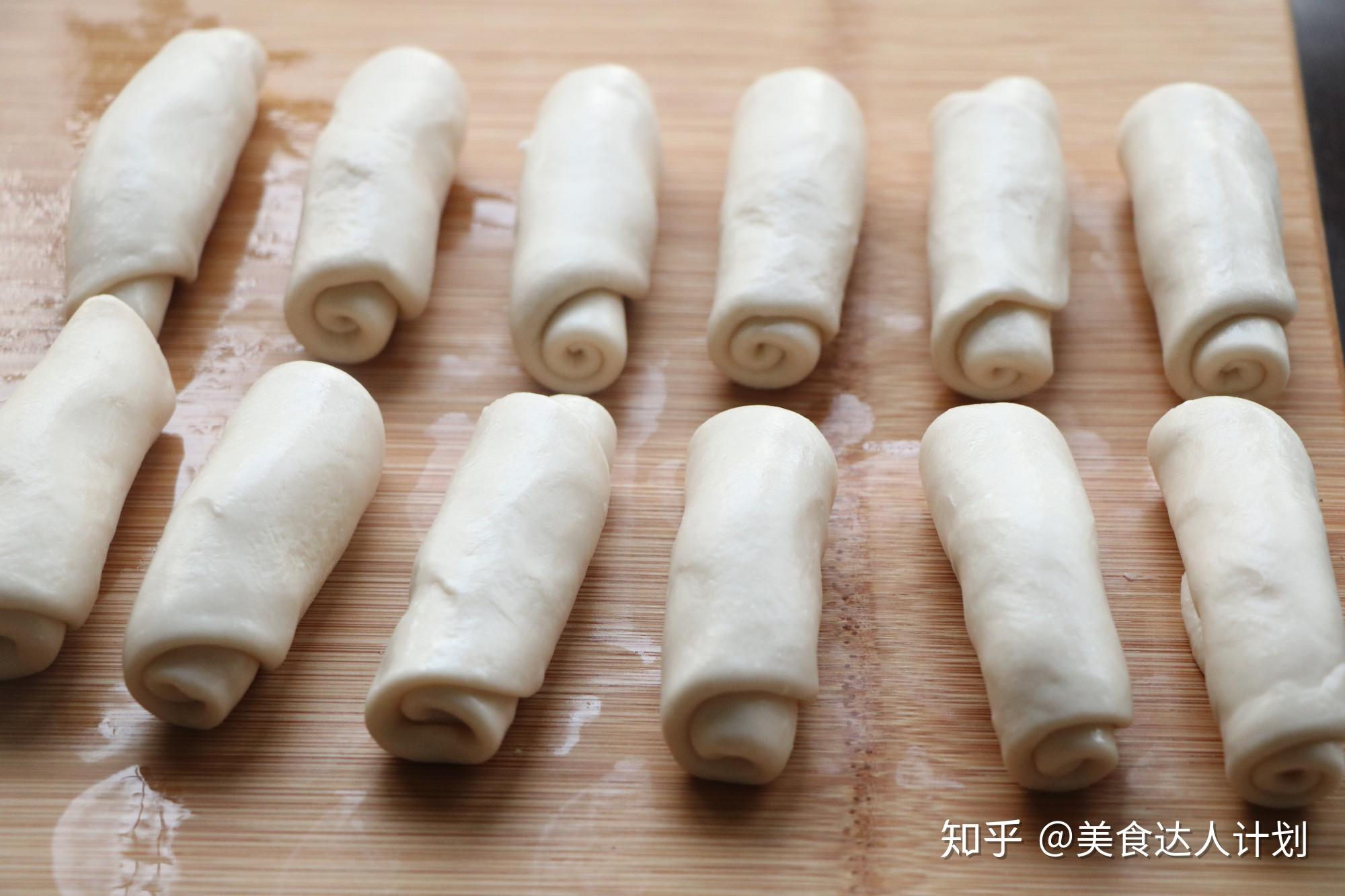 5、再取第一个卷好的,接口朝上,再次擀长,再次卷起来,保鲜膜密封醒发;