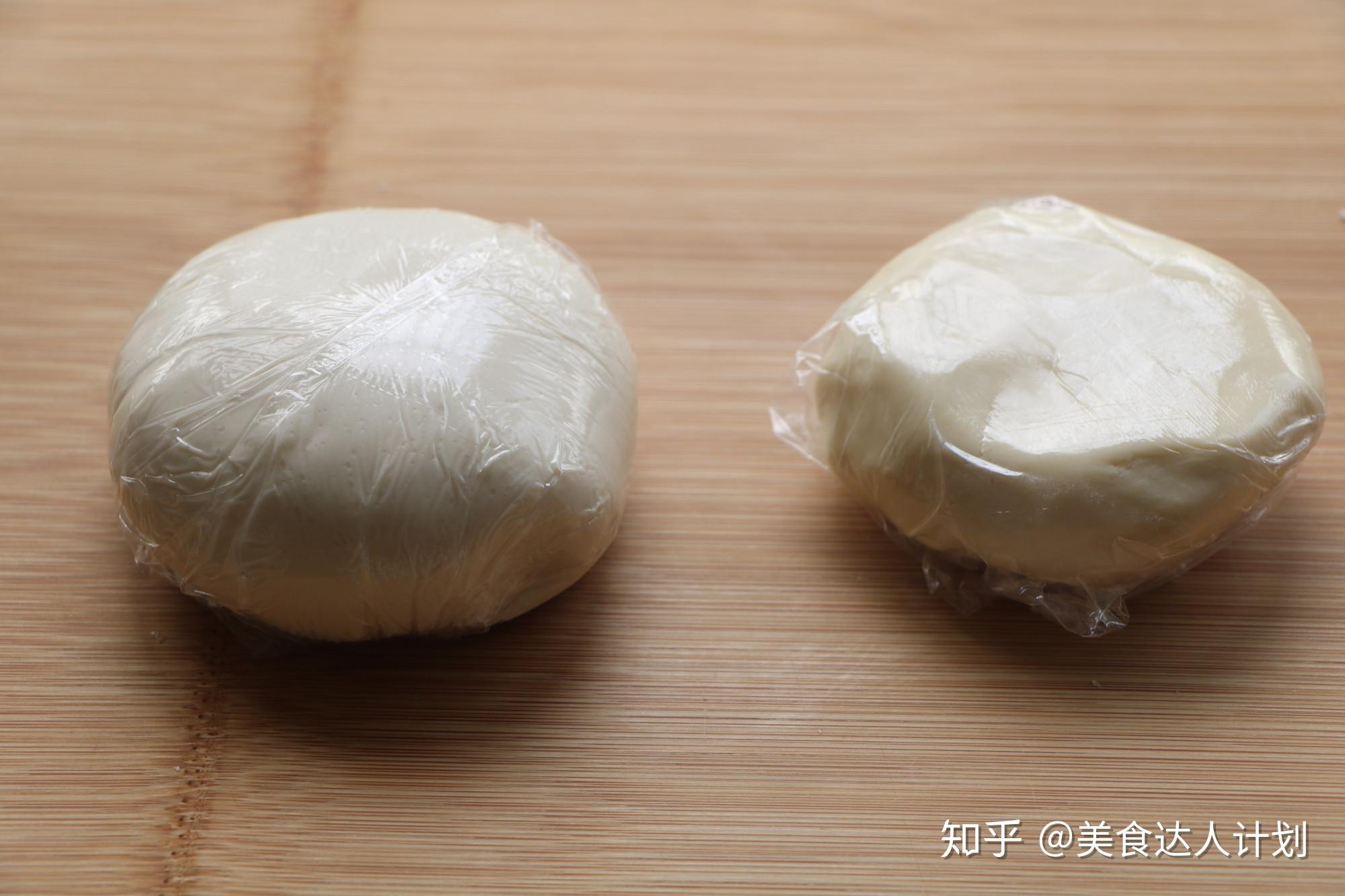 1、先把水油皮的材料混合,揉成团以后,揉出手套膜,面团有很好的延展性,把面团整理出光面,密封放在一旁醒发;再把油酥的材料混合,抓捏成团,同样密封放一旁醒发;