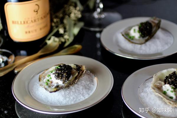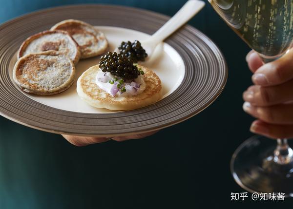 若你觉得把鱼子酱作为主菜太过单(奢)调(侈),可以试试它和生蚝的组合。生蚝裹藏在鱼子酱下面,丰腴与爆裂的口感相互撞击,甘甜与咸鲜相互叠加,像一首华丽又绵长的舌尖交响曲。除此之外,鱼子酱还有一种源自俄罗斯的经典吃法:迷你的俄罗斯薄煎饼Blini放上一勺酸奶油,再点缀满满一小勺鱼子酱。