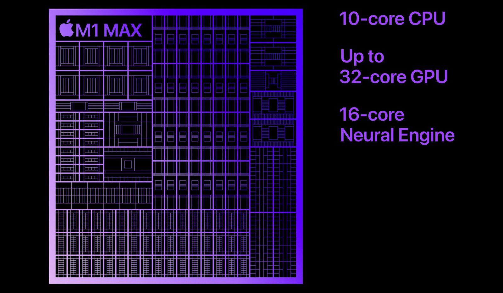 M1 Max,一个带有24核GPU,另一个带有32核GPU。32核选项是高端机器中可用的高端选项,而24核GPU仅作为按订单构建选项提供。据苹果称,32核M1 Max比原始M1芯片快4倍。它还提供与紧凑型专业PC笔记本电脑中的高端GPU相当的性能,同时使用更少100瓦的功率。