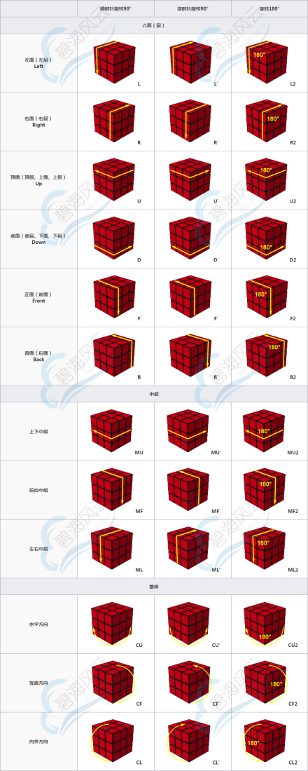 旋转方向:顺时针旋转90°,直接写各层代号;逆时针旋转90°,在各层代号后缀【'】或【i】;旋转180°,在各层代号后缀【2】或【2‘】(默认顺时针方向旋转180°);旋转两层,则用小写各层代号或在后面加上【w】。