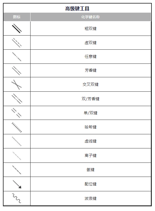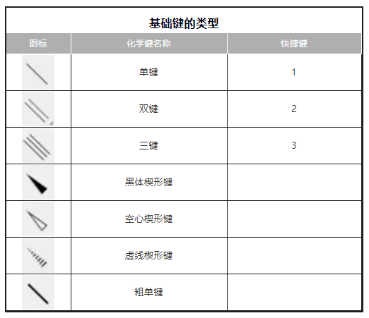 目前版本提供以下基础键类型,点击需要的化学键或使用相应快捷键,就可以在画板上进行绘制。