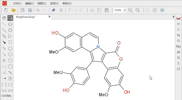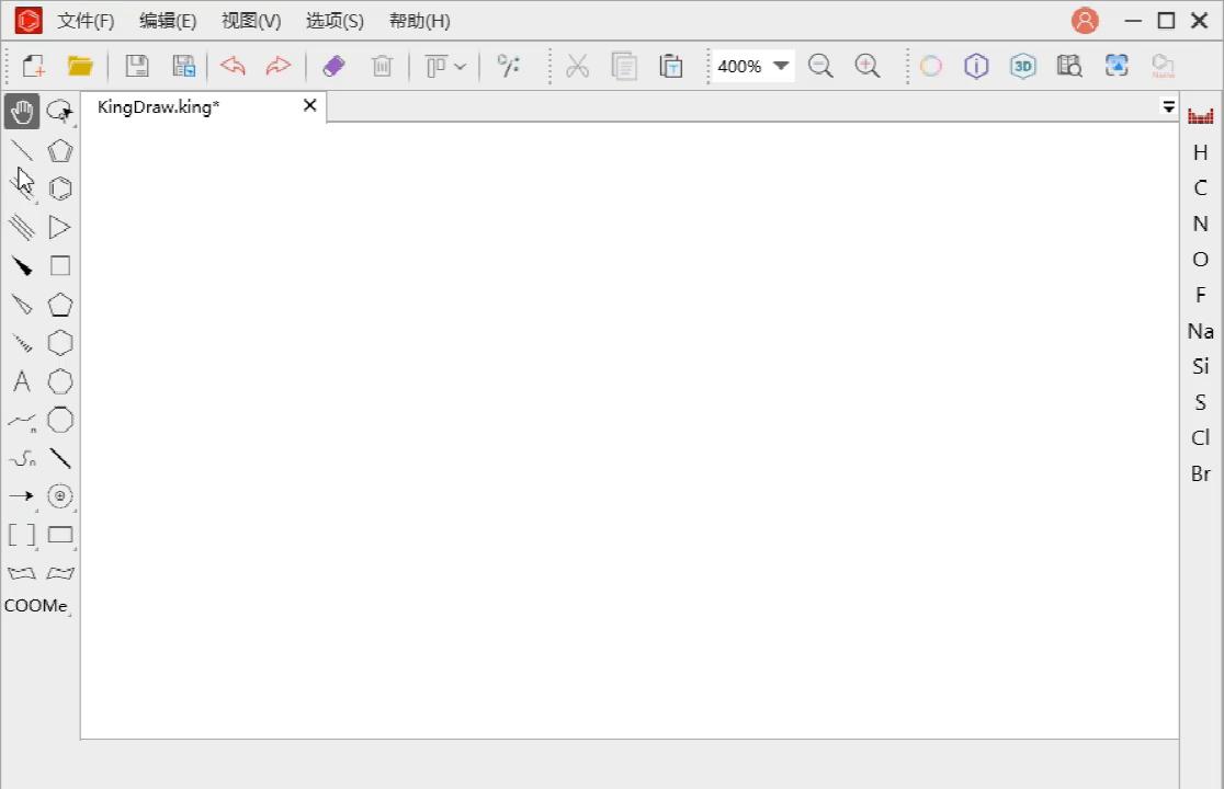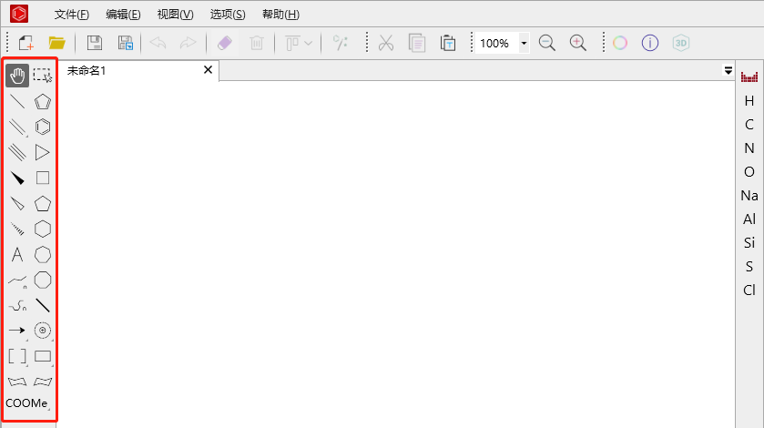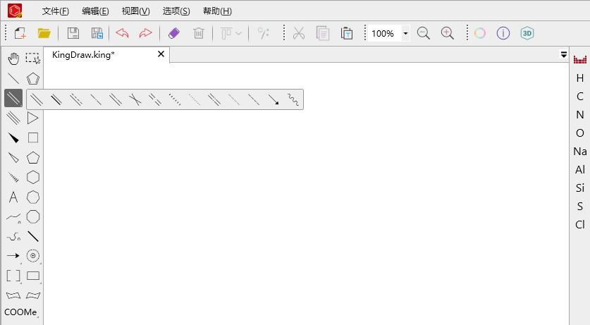 KingDraw PC v1.0的左侧工具栏中包含绘制结构式的多种键和工具,包括化学键、环形模版、电荷工具、括号工具、基团工具,以及流程图工具等等,方便我们绘制各种结构式。