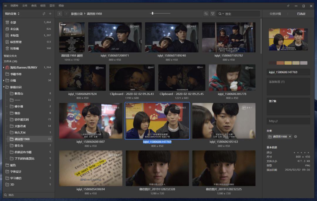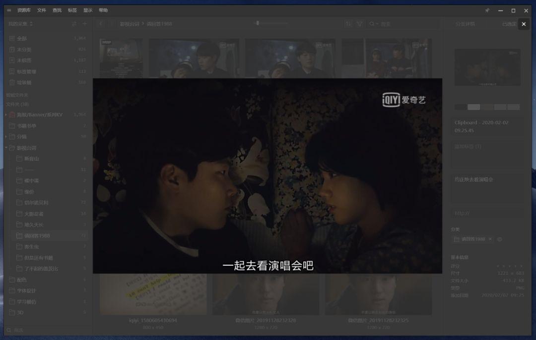 除了保存一些素材图片,大部分时间,我还是将 Eagle 用作一个 影视剧截图整理工具 ,为每一部剧建立一个文件夹,且右侧可以为每张图片 添加文字备注或链接 ,方便对图片进行 检索 或 溯源 。
