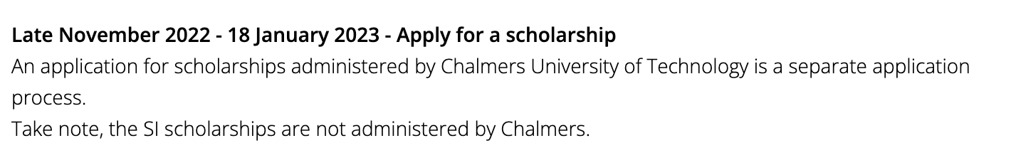 - 请注意,电子申请表格只用于由查尔姆斯管理和颁发的奖学金。在满足资格要求的前提下,你可以申请多个奖学金。