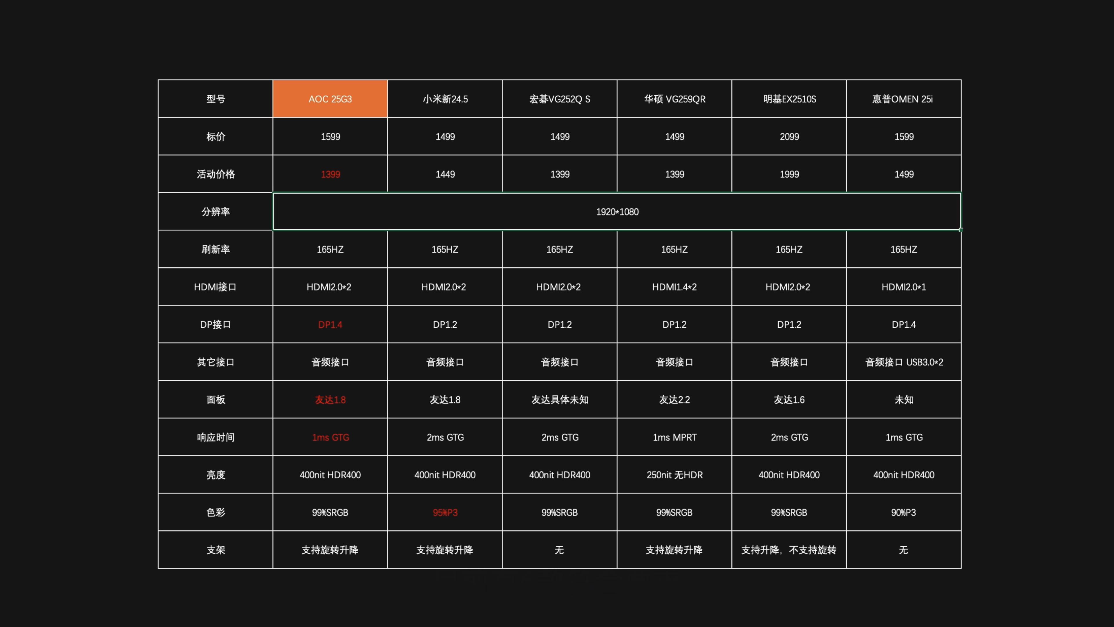 我大致统计了下,目前市面上24.5英寸、165hz的产品,