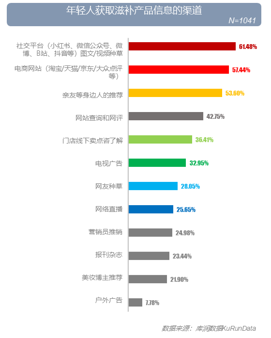 年轻人养生/滋补信息获取渠道中,具有 超级流量的社交平台图文/视频排名第一,其次是电商网站、亲友推荐及网评等;