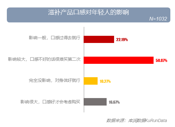 近八成年轻人表示自己购买滋补类产品会受到产品口感的影响,近三成年轻人认为产品口感不会影响自己再次购买。
