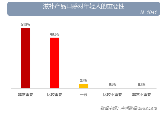 九成多的年轻人表示滋补类产品口感对自己很重要 ,仅不到一成年轻人认为滋补产品口感对自己不重要。