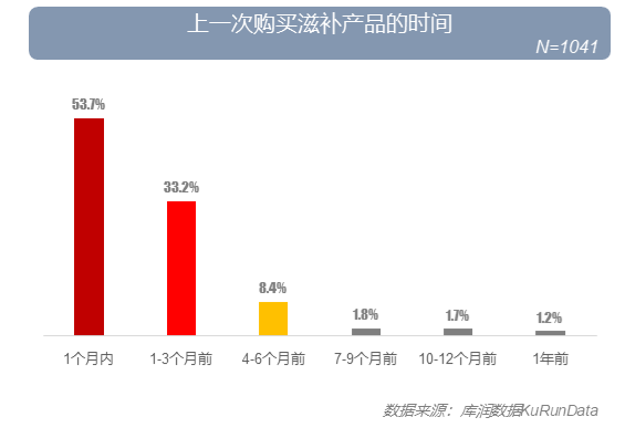 在买过养生滋补产品的年轻人里,约有九成多的年轻人表示近半年内都购买过滋补类产品,仅有不到一成的年轻人表示上次购买时间超过半年以上。其中,近一个月内购买过的占53.7%。